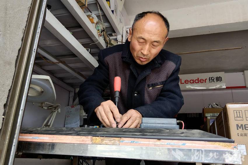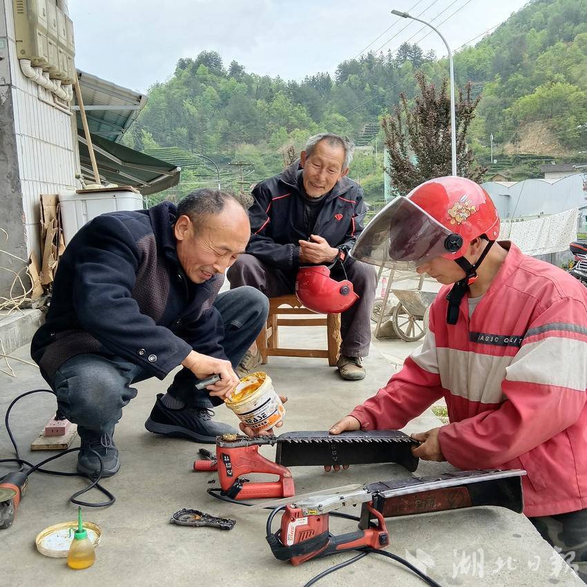 “电器维修保养都是免费帮忙。”家住磨坪的舒化兴、舒开国父子抽中午时间来童德生的店里维修两把采茶机,上黄油、紧螺钉,几分钟搞定。