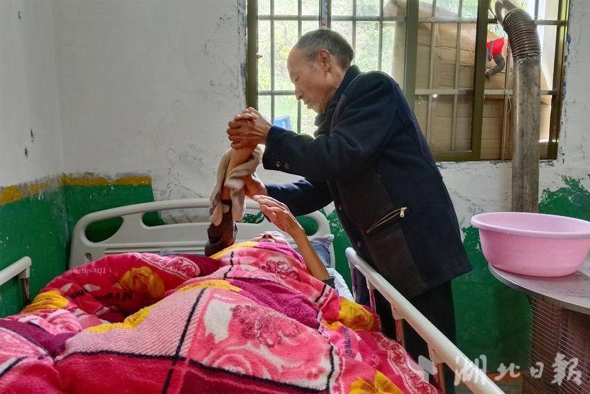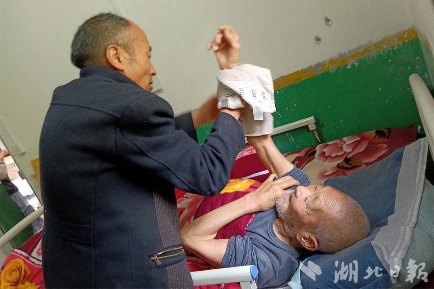 喂饭、翻身擦洗、换纸尿裤、按摩双腿……这些琐事对常人来说都不易,对身患残疾的童德生而言更是艰难。每一次搀扶、每一次起身,他都要付出数倍于常人的力气,可他从不抱怨。