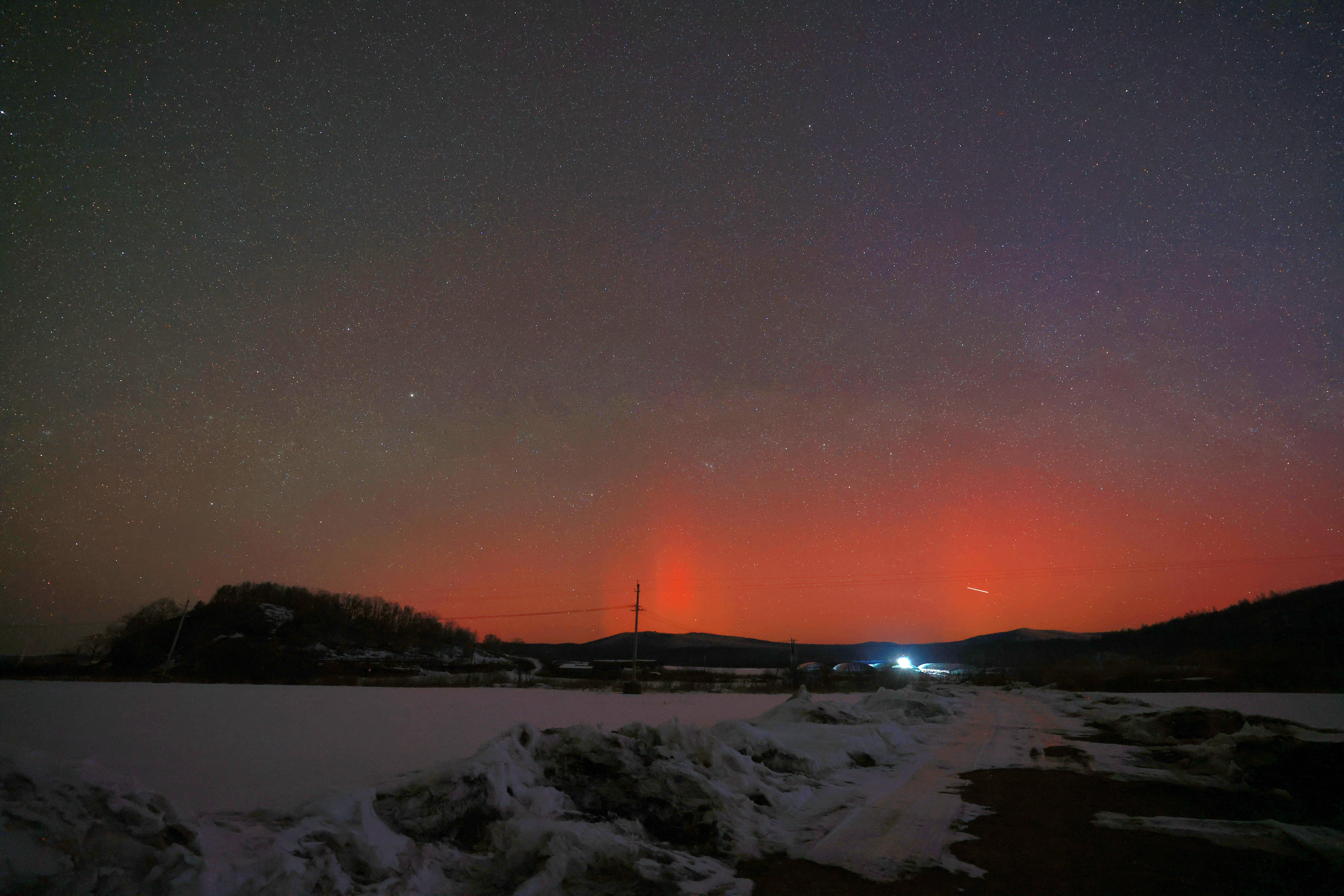 这是3月22日在黑龙江省北大荒集团北安分公司长水河农场有限公司拍摄的绚丽极光。新华社发(钱泊羽摄)