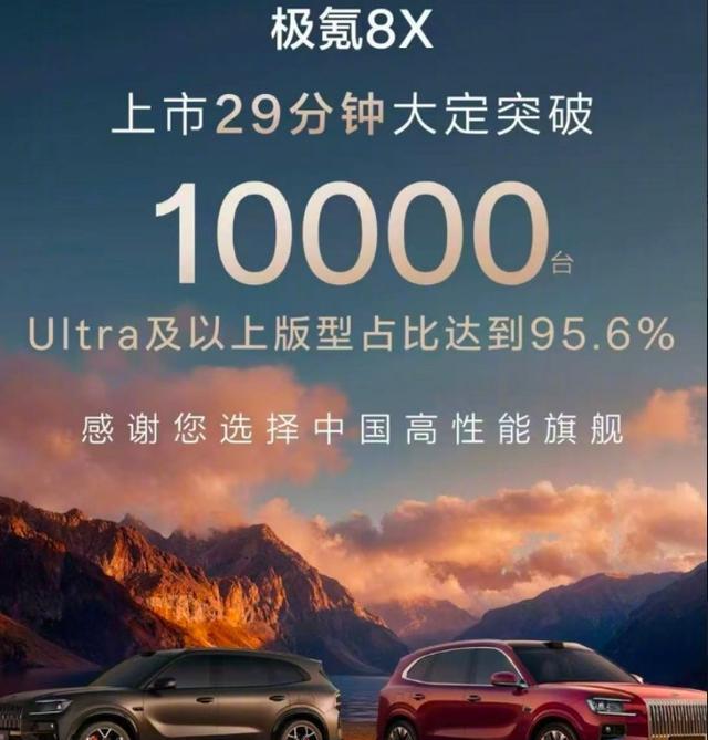 #极氪 8,29 分钟大定破万# 刷屏车圈,极氪 8X 开启预售,仅 29 分钟大定订单突破 1 万台,创下国产纯电性能 SUV 预售新纪录,火爆程度碾压同级竞品,成为继小米 SU7、问界 M9 之后,又一现象级国产纯电爆款,彰显国产性能车的强大号召力。