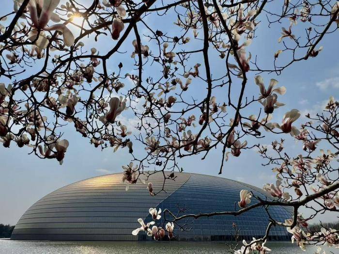 作为京城早春的“报春信使”,大剧院东北角的望春玉兰眼下满树繁花,花瓣洁白带淡紫晕,清香淡雅,先花后叶的枝桠舒展灵动,与银灰色穹顶、粼粼水面构成现代建筑与自然繁花的和谐画卷。